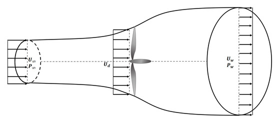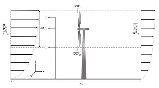 where subscript ∞ denotes flow conditions at the inflow, subscript w denotes flow conditions at the far wake, is the vertical turbulent momentum flux at the top of the control volume, is the vertical turbulent momentum flux at the bottom of the control volume, is the length of the control volume in the axial direction, and is the height of the control volume. Furthermore, we can assume that pressure far upstream of the wind turbine and far downstream of the wind turbine are equal to the undisturbed static pressure (). Therefore, we can neglect the pressure gradient in the axial direction, for the control volume in Figure 3. Applying this assumption to Equation (7) results in the following: