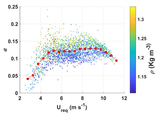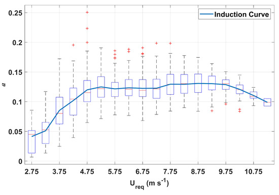 Values of both a and are unknown in Equation (23). Therefore, solving this equation for each ten-minute period requires an iterative procedure in which an initial value for is assumed, then Equation (23) is solved for a, an induction curve is created for each value of , and the one that results in the most accurate power prediction is chosen. The induction curve is created similar to the standard power curve. The values of a obtained from Equation (23) and for a fixed value of are divided into bins of 0.5 m s−1, and a curve is fitted to the bin-averaged values of axial flow induction factor. Figure 11 depicts the induction curve that results from this bin-averaging procedure, for wind speeds up to 11 m s−1, the operational range for the turbine in this study.