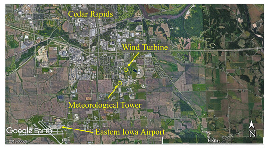The wind power generation data considered in this study belongs to a stand-alone wind turbine, built in 2012 on the northeastern part of Kirkwood Community College in Cedar Rapids, Iowa (Figure 6). However, the atmospheric data used for characterizing the ABL come from a tall meteorological evaluation tower (met tower) located at an approximate distance of 900 m south of the wind turbine. The period of study spans from 20 February to 18 June 2018. More information about this site can be found in [2].
