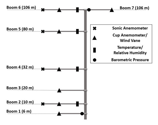 A schematic of the met tower and the instruments installed is shown in Figure 7. All booms are instrumented with cup anemometers and wind vanes, in order to characterize the velocity profile within the atmospheric boundary layer. Booms 1–6 extend west, whereas Boom 7 extends east at the top of the tower. Boom 4 is aligned with the lower tip of the rotor (32 m), Boom 5 coincides with the hub-height (80 m) and Boom 6 is at the top of the tower (106 m). These three booms along with Boom 2 (10 m) are equipped with sonic anemometers and are 21 feet long, while the other booms are shorter and extend for 12 feet. For characterization of the wind profile at the inflow, sonic anemometers, wind vanes, temperature, and relative humidity sensors at heights 32 m, 80 m, and 106 m are considered in the models.