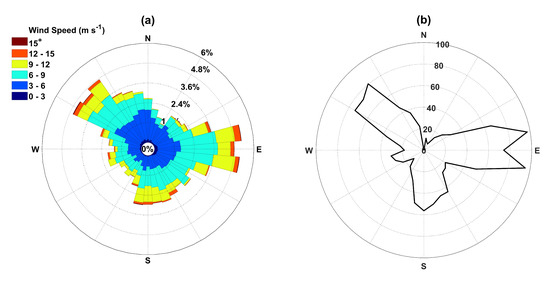 Distribution of wind and generated energy during the four-month period of study: (a) wind rose from SCADA data and (b) energy rose from SCADA data in MWh, only for periods when the turbine was operating. The energy rose is generated by considering bins of 10°, and integrating the total amount of energy generated for each bin in MWh.