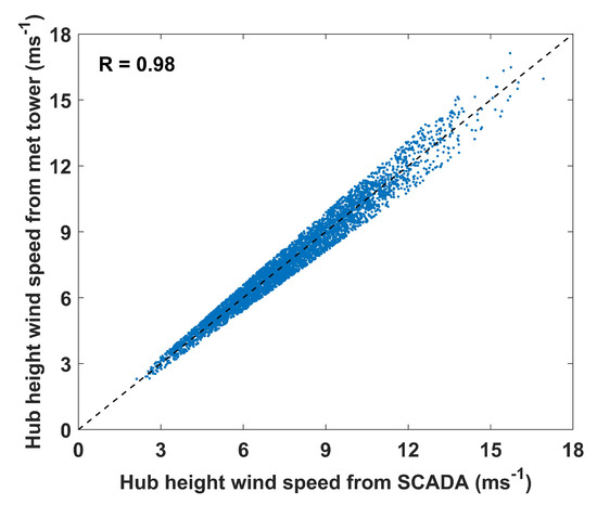 Moreover, data from the met tower need to be compared with nacelle measurements to make sure the wind profile at the met tower is the same as the one at the wind turbine. Li et al. [28] used a large-scale snow PIV system to characterize the induction zone for a wind turbine similar to the one in this study, and reported good agreement between wind speed at the nacelle and free flow. Furthermore, Smith et al. [36] studied wind turbines located in three different sites and found little difference between power prediction based on nacelle measurement and power prediction based on met tower measurement. In this study, hub-height wind speed measured at the met tower is compared to nacelle measurement, a 10% threshold is applied to the difference between the two measurements, and data not within this threshold are removed. After applying this criterion the coefficient of correlation between the two measurements for the remaining data points is 0.98, which is close to the values reported in [36]. The comparison of wind speed measured at the met tower against nacelle measurement is shown in Figure 9.