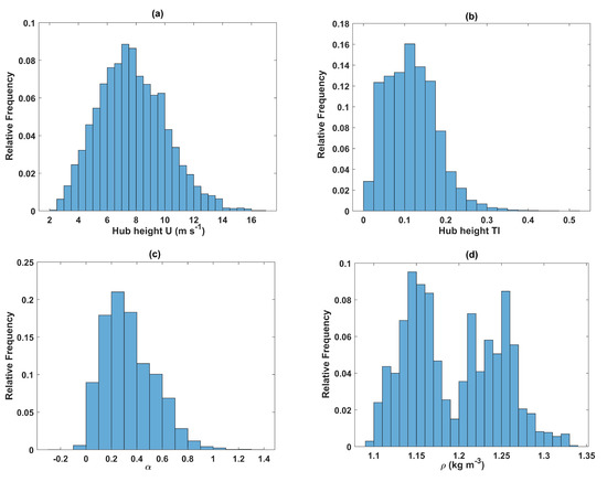 Observed distribution of ten-minute averaged atmospheric variables, including: (a) hub-height wind speed (m s−1), (b) hub-height turbulence intensity (), (c) shear exponent, (d) hub-height air density (kg m−3).