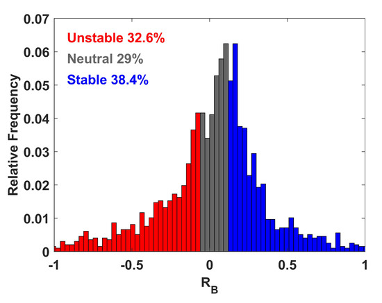where g is the gravitational acceleration (9.81 m s−2), is the vertical change in temperature, is the change in height and is the average temperature over . For quantifying , measurements at the lower tip of the rotor (32 m) and the top of the met tower (106 m) are used to represent stability conditions across the rotor swept area. For classifying stability regimes, the distribution of is divided into three subsets of roughly the same size. This approach is similar to the one proposed in [12,38] and results in a better separation between stable and unstable regimes [12]. Figure 12 shows the classification of stability regimes based on distribution, where neutral conditions correspond to the range .