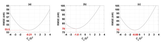 The effect of on of power prediction showing optimum values for: (a) stable regime, (b) neutral regime, (c) unstable regime, normalized by , where D is the diameter of the wind turbine.