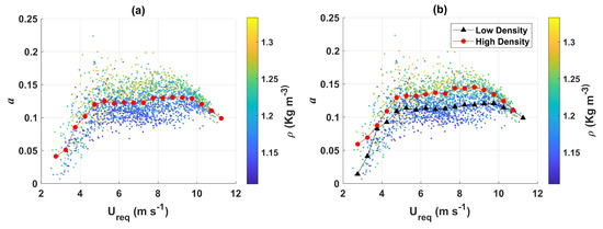 (a) Induction curve resulting from values of found for different stability regimes and then dividing axial flow induction factor values into bins of 0.5 m s−1 for and (b) two induction curves resulting from division of data into two smaller sets based on air density.
