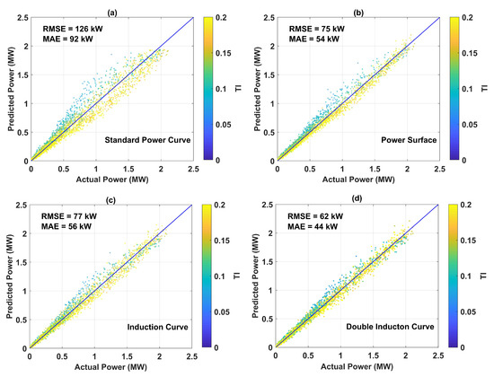Performance of: (a) standard power curve, (b) power surface, (c) induction curve, and (d) double induction curve, for predicting power generation of the wind turbine.