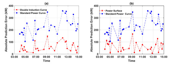 Time series of error reduction in power prediction during a sample twelve-hour period on 16 February 2018 from 3:00 a.m. to 3:00 p.m., resulting from (a) double induction curve, and (b) power surface, compared to the standard power curve.
