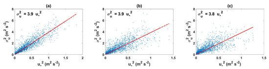 The linear relation between and while setting the intercept to the origin, and for the sonic anemometers on (a) boom 4 (32 m), (b) boom 5 (80 m), and (c) boom 6 (106 m).