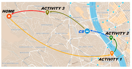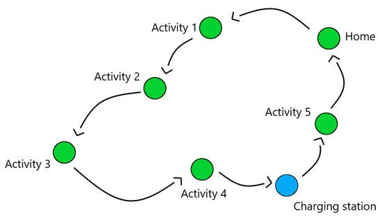 The activity-based analysis of transportation systems stems from the idea that the demand for transportation between locations is interconnected with the demand for participation in some activity. As indicated by a series of works in the literature [17,18,19], it has been extensively studied and used for the analysis of travel behavior and the planning of transportation systems. Our work on the optimization of daily activity chains falls under the umbrella of activity-based research in transportation. Recent notable articles [20,21] show that activity-based modeling has been successfully applied to cases where electromobility is incorporated into transportation systems. In the first paper by Dong et al. [20], the impact of different types of deployment of charging infrastructure is analyzed in regard to the range anxiety of EV users. An activity-based method is used to evaluate the deployments according to travel patterns. In the work by Kontou et al. [21], activity-travel patterns from a National Household Travel Survey data are used, in order to assess two schemes for centralized charging management of EVs, one scheme that regards preferences of individuals and another that considers the government perspective. The results indicate the differing nature of the interests of those two stakeholders, and confirm that the availability of charging stations at the workplace can greatly affect the charging profiles of EV travelers. The latter observation is one of great importance that can be found in other studies [8], too.