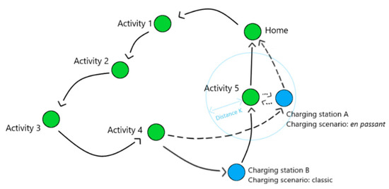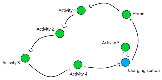 In Figure 2, present the en passant charging scenario of the DACO-EV. The charging detour happens between Activities 4 and 5, and the transfers from the CS to the location of Activity 5 are represented by the dotted lines. In this case, the EV remains at the CS, while the user processes Activity 5 using another mode of transportation (e.g., walking).