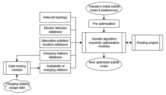 Before actually providing information about the implementation of the GA and its mechanisms that allow the effective solution of the DACO-EV, an overview of the work is presented in Figure 3 that depicts the method, its parameters, external tools, and data used. On the one hand, the traveler provides an initial activity chain and information about his or her preferences by setting the first, and thus the second, group of parameters. On the other hand, the third group of parameters provide external information, such as the network topology (road network and elevation), the electric vehicle database for consumption calculations, and the alternative activities’ location database for calculating the optimized activity chain by examining the full spectrum of the spatial possibilities for the activity chain. Finally, based on the charging station usage data and other related information to the CS (i.e., charging stations database), the availability of charging stations was calculated using data mining techniques. Before using the heuristic optimization model, a pre-optimization is performed, and the routing engine is used to calculate optimal routes between activity locations. As a result, the genetic algorithm calculates optimized activity chains for users.