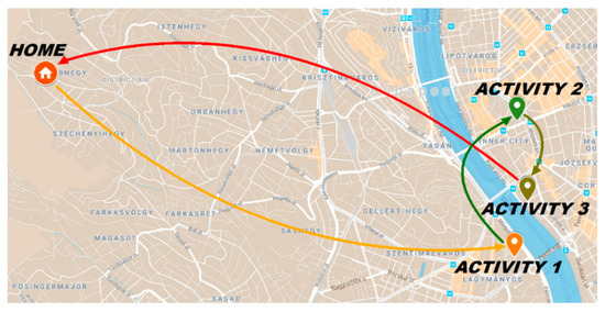 In Figure 6 and Figure 7, and Table 7 and Table 8, we present an instance of case 3 in more detail to show how an activity chain of the traveler is initially set and how it can change after applying our algorithm. In Figure 6, we can see the initial activity chain, and in Figure 7, we can see how the algorithm produces an optimal activity chain. The travel time of the tour depicted in Figure 6 is 70.75 minutes (min), while the tour depicted in Figure 7 takes 55.37 min. The figures present the spatial aspects of the initial and optimized activity chain, and the tables present the temporal attributes of the two activity chains.