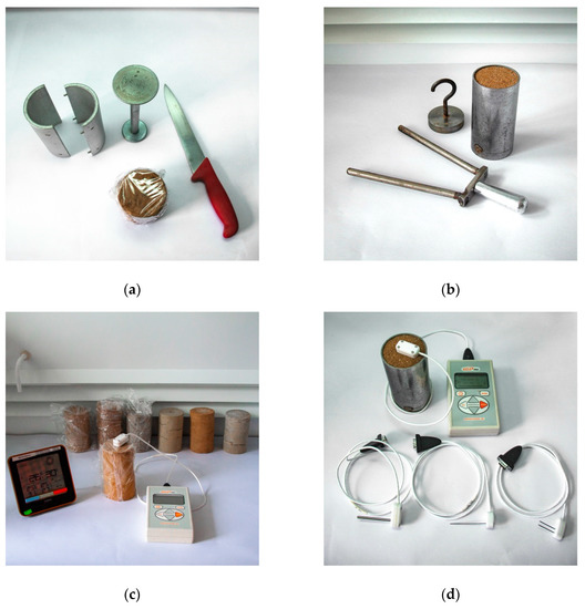 Equipment for laboratory testing of thermal conductivity of soil: (a) Metal mold to form cylindrical samples of cohesive soil with a knife and rammer; (b) Steel cylinder with tapping fork that is used to form non-cohesive soil samples; (c) Molded cohesive soil samples during analysis; (d) A set of exchangeable thermal needle probes with KD2 Pro Thermal Properties Analyzer.
