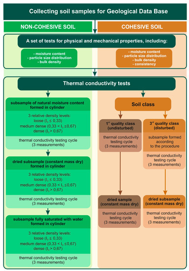 The article presents the methodology of conducting serial laboratory measurements of thermal conductivity of recompacted samples of cohesive and non-cohesive soils. The presented research procedure has been developed for the purpose of supplementing the Engineering–Geology Database and its part–Physical and Mechanical Properties of Soils and Rocks (abbr. BDGI-WFM) with a new component regarding thermal properties of soils. The data contained in BDGI-WFM are the basis for the development of maps and plans for the assessment of geothermal potential and support for the sustainable development of low enthalpy geothermal energy. Effective thermal conductivity of soils was studied at various levels of water saturation and various degrees of compaction. Cohesive soils were tested in initial moisture content and after drying to a constant mass. Non-cohesive soils were tested in initial moisture, fully saturated with water and after drying to a constant mass. Effective thermal conductivity of non-cohesive soils was determined on samples mechanically compacted to the literature values of bulk density. Basic physical parameters were determined for each of the samples. In total, 120 measurements of thermal conductivity were carried out, for the purposes of developing the guidelines which allowed statistical analysis of the results. The results were cross-checked with different measuring equipment and with the literature data.