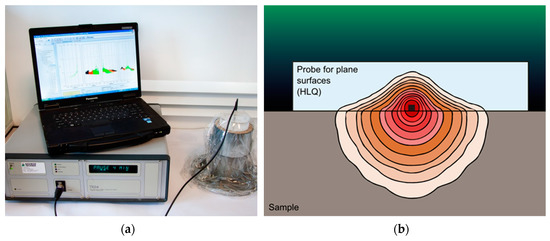 To verify validity of the results obtained in compliance with the above mentioned procedure the results were cross-checked using TK04 Thermal Conductivity Meter with disc-shaped 88-mm diameter standard HLQ probe presented in Figure 3a. The sensor’s needle is embedded in the underside of the disc material. HLQ probe covers thermal conductivity range of 0.3 to 10 W·m−1·K−1 and can be used for measuring various plane surfaces [31]. Thermal conductivity is measured using transient hot wire method. Heat generated by the disk-shaped probe penetrates the sample and partially also the probe material (Figure 3b). TK04 software provided by a producer automatically corrects this effect to evaluate thermal conductivity of the sample.