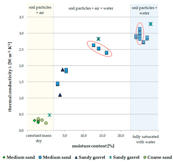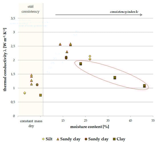 Similarly to non-cohesive soil, thermal conductivity of cohesive soil increases with increasing water content. The highest thermal conductivity values of cohesive soils are observed in plastic state. However, at some point of moistness adding more water to the sample has a reverse effect on measured thermal coefficient values (clay sample, inside dashed red ellipse). It is caused by the fact that the bulk density of a cohesive soil decreases at high water contents; the percentage content of water grows and the content of the soil’s particles drops. As pores are getting filled with water, soil particles are losing contact with each other and heat transfer inside the sample becomes less efficient.