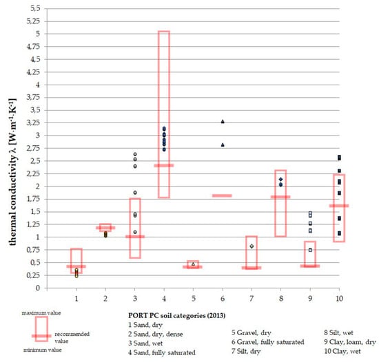 Ranges of thermal conductivity values provided by PORT PC Guidelines were presented in Figure 6 in graphical form, to give reference to results of thermal conductivity tests obtained in the article. Both groups of the results are mostly consistent; results of our measurements mostly fit in PORT PC recommended value ranges (Figure 6).