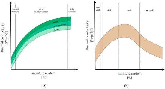 The highest thermal conductivity values were obtained for sandy clays (up to 2.6 W·m−1·K−1). The effect is believed to be caused by high quartz content in this type of soil. Clay samples present significantly lower thermal conductivity values (up to 1.9 W·m−1·K−1). It is a result of the lower thermal conductivity of clay minerals [26].