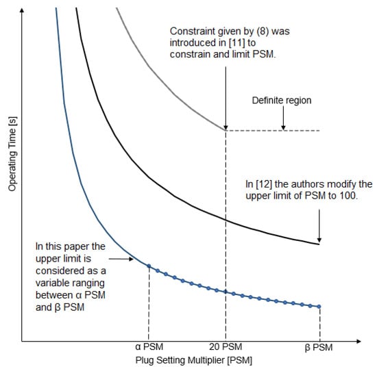 Modern DNs present changeable operational modes that increase the complexity to obtain the optimal settings of directional OCRs. To tackle this problem, the authors of [] proposed an alternative to the conventional protection coordination approach, adding a new constraint that takes into account the Plug Setting Multiplier (PSM). PSM is the ratio between the fault current seen by the relay and the pick up current. The tripping characteristic of overcurrent relays is limited by the PSM value. The standard characteristic curves of commercial relays are generally defined in a region where the minimum value is 1.1 times the PSM, whereas the maximum value is 20 times the PSM value. The DG units in microgrids considerably increase the short circuit level. Therefore, for different faults, this maximum value defined for PSM might be exceeded, affecting the sensitivity of the protections and causing loss of the coordination protection scheme. The new constraint introduced in [] considers the above-mentioned conditions by setting the maximum value of 20 times the PSM.