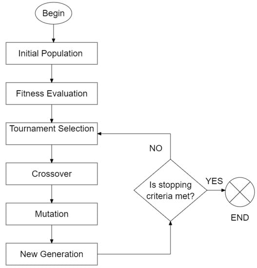 The model given by (1)–(9) was solved using a genetic algorithm (GA) implemented in Matlab. Genetic algorithms are metaheuristics that mimic Darwinian evolution in which the fittest individuals have greater chance to transmit their genes into the next generation. Other metaheuristic techniques have also been used for solving the optimal coordination of protections, such as particle swarm optimization [,] and differential evolution []. GAs have shown to be effective in tackling the overcurrent protection coordination problem as indicated in [,,]. The flowchart of the GA procedure is depicted in Figure 2.