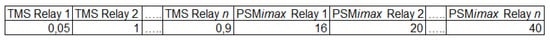 The GA starts with an initial set of candidate solutions known as population. Each individual within the population is represented by a vector that codifies a possible solution to the problem. In this case, every element of the vector corresponds to a setting of and for each relay. In the proposed protection coordination model, and are the decision variables. The length of the vector corresponds to twice the number of relays present in the test network. The GA implemented generates the initial population randomly considering the minimum and maximum limits of the decision variables. Figure 3 depicts an example of a candidate solution. In this case, the candidate solution indicates that the TMS of relays 1, 2, and n must be set to 0.05, 1, and 0.9, respectively. Also, the maximum PSM limits for the same relays must be set to 16, 20, and 40, respectively.