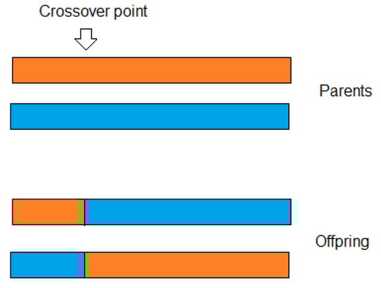 The crossover or recombination is the stage of the algorithm in which parents exchange their genetic material to generate new individuals. In this case, the crossover is performed over two winners of the tournament (parents), then their bits are crossed at a random position of the vectors generating two new individuals (offspring). In this case, each new individual preserves part of the genetic material of both parents. Figure 4 illustrates the crossover stage.