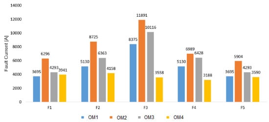 A comparison of operation times for different OMs using multiple and a single set of coordination parameters is presented in Table 13. Operation times reported in columns 2 through 4 in Table 13 consider an independent set of parameters for each OM as described in Section 4.1, Section 4.2, Section 4.3 and Section 4.4. Note that for all OMs the proposed approach presents lower operation times (column 4). On the other hand, the operation times presented in column 5 are computed considering a single set of parameters suitable for all OMs. Such a single set of parameters results in different operation times depending on the OM of the microgrid. As expected, obtaining a single set of coordination parameters suitable for all OMs results in higher operation times, as shown in column 5 of Table 13. Note that the works in [,] do not present a single set of coordination parameters suitable for all OMs, which does not allow a direct comparison with the results of the proposed approach. Despite this, note that the proposed approach outperforms the results of [] in OM1 and OM2 and the ones of [] in OM1 even when considering a single set of coordination parameters for all OMs.
