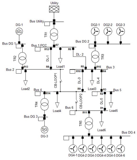 Protection systems in microgrids must deal with the following two aspects: (a) the dynamic behavior that is usually presented due to intermittent energy resources and (b) the microgrid operation mode which can be connected or disconnected from the main power grid [,]. Microgrids are reconfigurable electric power systems with variable levels of current fault and bidirectional power flows []. Microgrids have changed the traditional paradigm of radial DNs into non-radial and flexible systems. Therefore, finding a protection scheme that ensures speed, selectivity and reliability has become one of the most challenging tasks in microgrids operation planning [].