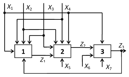 On the basis of data analysis from a series of passive experiments during some weeks, the model was substantiated for the process of radial burden and gas flow distribution. The volume of a hopper VB = Z1 on the surface was considered as an intermediate factor of the process. The level of burden charge X1, mass X2, the relative quantity of pellets in burden X3, the indicator of charging system X4, and the level of central gas flow development Z3 were set as the main factors influencing the process of hopper formation (block 1 in Figure 1). In order to determine the quantitative characteristics of the charging system X4, published data on its influence on the radial burden and gas flow distribution were used. The value of X4 indicator was determined by ranging the used charging system with respect to its influence on peripheral gas flow (CCAA↓, CACA↓, CAAC↓, CA↓ CA↓, ACAC↓, AACC↓, AC↓ AC↓), and providing the X4 indicator with the proper order number in the row. The level of the central gas flow development Z3 was determined as the relation of maximum carbon dioxide content in the gas and its content in the throat central zone. The volume of the funnel significantly affects the ore load on coke in the central area of the grate Z2 (block 2 in Figure 1) and the degree of the central gas stream in the blast furnace Z3 (block 3 in Figure 1).