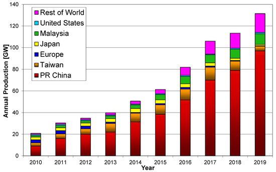 World PV Cell/Module Production from 2010 to 2019 (data source: [4] and new analysis).