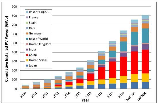 Cumulative Photovoltaic Installations from 2010 to 2020 (data source: [11,12,13] and own analysis).