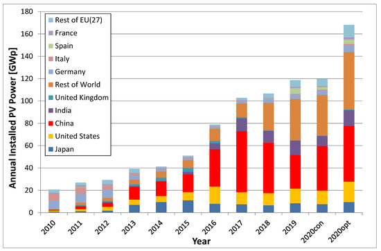 Annual photovoltaic installations from 2010 to 2020 (data source: [11,12,13] and own analysis).