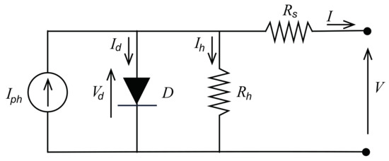 Figure 1 shows the SDM circuit: it includes the photoinduced current generator , which models the photovoltaic effect; a diode D modeling the P-N junction; and the resistances and representing the ohmic losses and the recombination losses respectively. Thus, the following five parameters appear in the model: