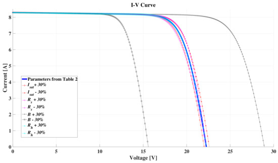 In Figure 2 a PV module I-V curve is shown by blue marks: it has been obtained by placing the values listed in Table 2 into Equation (5). The parameters in Table 2 refer to a 140 W PV Yingli solar panel working in STC, which have been obtained by the method proposed in [31] in STC. This PV module consists of 36 polycrystalline solar cells connected in series. In the same figure, the I-V curves corresponding to 30% variations of the parameters , , and B are also shown in magenta, cyan, red and black respectively. The I-V curve exhibits a significant sensibility with respect to variations of B and in proximity to the MPP and a dependency on in the high voltage range. The parameter depends on, almost directly, irradiance, and its value is usually assumed to be equal to the short-circuit current [2].