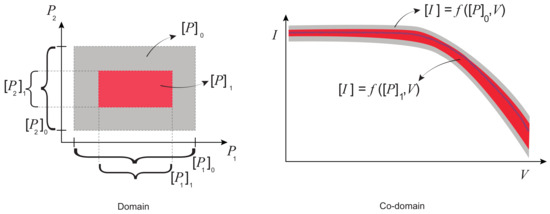 In the PV-oriented problem treated in this paper, the PV current given by the SDM (5) is the explicit function where is the interval valued vector of the parameters to identify and V is the real value of the voltage at which the current is evaluated. In case the set of interval values parameters is limited to two only, with the others being real values, the domain and co-domain of is qualitatively depicted as in Figure 3. In the bi-dimensional plane representing the domain, is a initial square region in gray resulting from the two interval parameters and . This corresponds to the co-domain . A contraction of the domain, which is represented by a smaller rectangle resulting from the sets and , corresponds to the co-domain . If performed through the classical real valued analysis, e.g., by a Monte Carlo approach, the computations of the gray and the red envelopes in the I-V plane should require the selection of a high number of samples in the gray and the red rectangles in the parameters domain, and thus, a high number of Monte Carlo trials. The higher the number of couples, the more accurate the evaluation of the corresponding envelope in the I-V plane, which is obtained by merging all the curves obtained, and the voltage value by voltage value, by taking the maximum and the minimum I values. Such a computation should be able to reveal whether the experimental I-V curve is included or not in the envelope, and thus whether the corresponding sets or are feasible. A reliable evaluation of the envelopes, if performed by using the classical real numbers, thus, through a Monte Carlo method, should be more time consuming the more significant the non-linearity and non-monotonicity of the function I are with respect to the parameters. Instead, IA is a tool that allows one to evaluate the envelopes corresponding to each set and by a single computation. Thanks to the IA properties, the result will be guaranteed to bound the true I range.