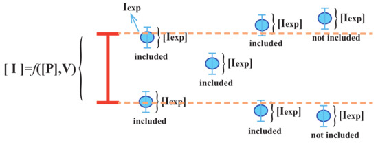 In Figure 6, the blue circles, which are the experimental data, are surrounded by blue bars representing a noise band, named . The red bars bound the interval of the current , which is computed by IA on a given interval parameters set. Thus, the inclusion property is reformulated by considering that the experimental value (blue dots) is included in the interval range (red interval) if the intersection between the red range and the blue range of that experimental point is not empty. The larger the noise or the uncertainty, e.g., related to the sensors used, affecting the experimental data, the wider the band and the higher the probability that the intersection between and is not empty, and thus that the corresponding set of parameters is feasible.