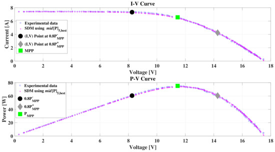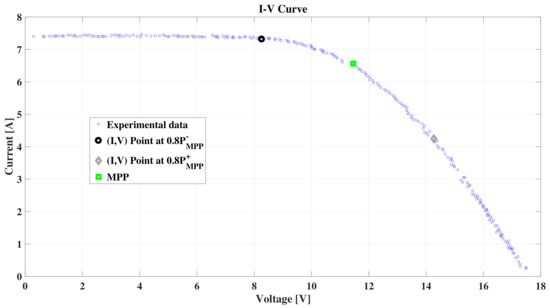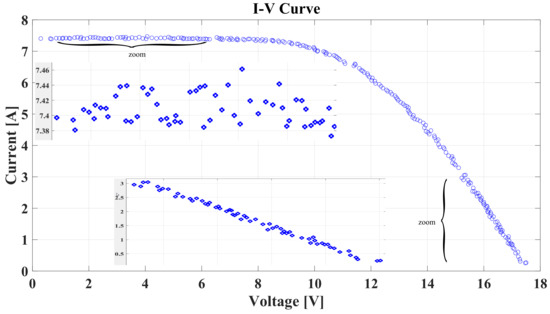 Figure 7 shows an experimental set of I-V data referring to a 140W PV Yingli solar module that have been acquired at an irradiance equal to 849 W/m2 and at a temperature equal to K: they have been measured by using a low cost system described in detail in [37], which has the drawback of providing a high number of data in the low current range and a low density of measurements at low voltages. The I-V curve is obtained by the capacitor charging method, which takes an acquisition time of 0.05 s. The experimental setup is described in detail in [37]: the PV module output is made available in the laboratory through a 10 m long cable. Thus, the acquired I-V curve also takes into account the parasitic resistance of the cables, which is 60 m. Figure 7 shows that the module under test has suffered degradation, due to 3.5 years of long operation.