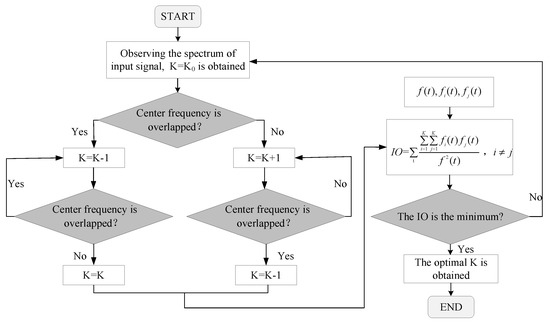 As reported in [31,32], the optimal mode number K can be chosen mainly through observing the central frequencies of the decomposed modes, and then the correctness of the selected K can be determined by using the orthogonal index (IO) [27], which is defined as,