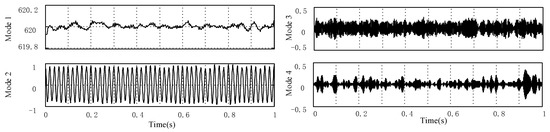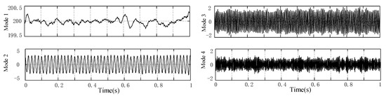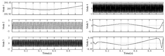 As shown in Figure 9 and Figure 10, the input DC bus voltage is decomposed different modes by utilizing the VMD-HT and EMD algorithm. With the VMD-HT algorithm, the ripple components with constant and time-variant amplitude are extracted accurately, while the modal aliasing problem will occur when utilizing the EMD algorithm.