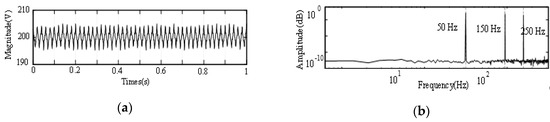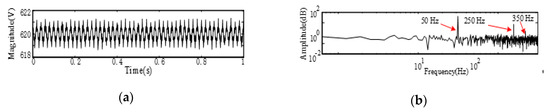 Next, the condition that the amplitude of the ripple components of simulation signal is time-variant is considered, where only of Equation (20) is time-variant. Figure 8 shows the amplitude and spectrum of the input DC voltage.