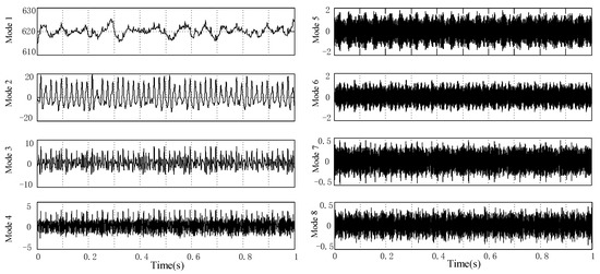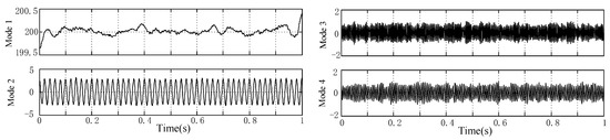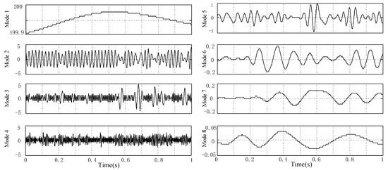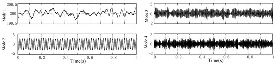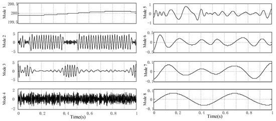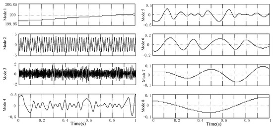 Figure 13 and Figure 14 show the decomposed modes of the corresponding VMD-HT and EMD algorithms. As seen, the input DC bus voltage is decomposed into 4 modes with the VMD-HT algorithm, including the main DC component and three ripple components. However, the input DC bus voltage is decomposed into 8 modes with the EMD algorithm, where the over-decomposition problem occurs and is even worse. Thus, the VMD-HT algorithm can realize the decomposition of complex DC bus voltage more accurately than the EMD algorithm under the noise condition.