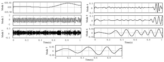 Next, by utilizing the EMD and VMD-HT algorithm, the DC bus voltage signal is decomposed. Figure 22 and Figure 23 show the decomposed modes of the corresponding algorithms. As can be seen, the VMD-HT algorithm decomposes the input DC bus voltage signal into 4 modes, including the main DC component and three ripple components. While the EMD algorithm decomposes the DC bus voltage signal into 7 modes. Intuitively, there will be the over-decomposition problem.