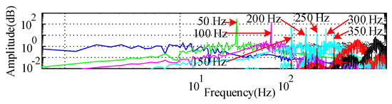 The amplitude and spectrum of simulation signal are illustrated in Figure 4. According to the VMD-HT algorithm, the mode number K needs to set before running. As can be seen in the spectrum, the frequency of the ripple components mainly contains 50 Hz, 150 Hz and 250 Hz. Thus, the mode number K is initially selected as 4. In order to better describe the selection process of K, as described in Section 3.3, the center frequency under different K is observed firstly and recorded it in Table 1. As seen in Table 1, when the mode number K is smaller than 4, some modes is missed. However, when the mode number K is bigger than 4, the modes with approximate center frequencies occur, such as 150 Hz and 161 Hz, which means that the over-decomposition of modes may exist. The spectrum of VMD-HT algorithm under K = 4 is shown in the Figure 5, where the ripple components are clearly revealed. Additionally, the IO of VMD-HT algorithm decomposition under different K is shown in Table 2. As can be seen, the IO is the minimum when the mode number K = 4. Therefore, the mode number K is optimal to 4.
