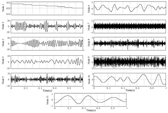 Figure 26 and Figure 27 show the decomposed modes of the corresponding algorithms. As seen, the VMD-HT algorithm decomposes the input DC bus voltage signal into 8 modes, including the main DC component and seven ripple components. While the EMD algorithm decomposes the DC bus voltage signal into 11 modes. Intuitively, there will be the over-decomposition problem.