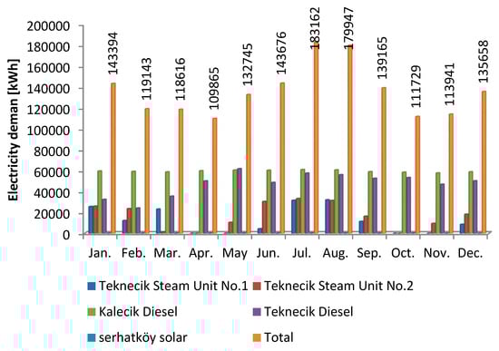 At present, electrical energy production in Northern Cyprus is provided almost entirely by petroleum, with the renewable energy sources in the country not playing an effective role. Currently, the electricity energy needs in Northern Cyprus are mainly generated from four power plants; namely, Kalecik Diesel (43.67%), Teknecik Diesel (34.83%), Teknecik Steam Unit No. 2 (12.27%), and Teknecik Steam Unit No. 1 (9.12%), the rest (0.11%) is generated from the solar PV system at Serhatköy [11], as is illustrated in Figure 1.