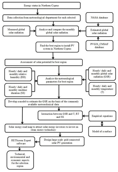 Regarding the literature review, it reveals a clear lack of evaluation of global solar radiation in terms of examining the best locations to install a PV system in Northern Cyprus. Furthermore, there is a clear lack of exploring the potential of large-scale grid-connected PV system generation in Northern Cyprus. Therefore, this paper is aimed at analyzing the global solar radiation for five different locations in Northern Cyprus based on measurements on the surface by the Meteorology Department and satellite imagery results from the Photovoltaic Geographical Information System (PVGIS) and RETScreen database. Furthermore, after determining the best location to install the PV system, mean hourly meteorological parameters including global solar radiation, air temperature, sunshine, and relative humidity are analyzed statistically, and the type of distribution functions are selected based on skewness and kurtosis values. The data, which covered January 2014–December 2016, are presented. With the values of hourly global solar radiation as a function of temperature, sunshine, and relative humidity, a study of the influence of these variables was carried out and a model of the surface was proposed to adjust the obtained curves. Moreover, this study provides the technical, environmental, and economic aspects of a large-scale PV system (100 MW grid-connected solar plant project) in the region selected as being best suited in Northern Cyprus; this has the potential to reduce the electricity consumption generated by diesel fuel by 33%. The technical, financial, economic, and environmental analyses of PV power plant developments were performed by RETScreen Expert software. The flowchart in Figure 3 illustrates the analysis procedure of this study.