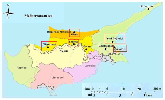 In this study, global solar radiation and other meteorological parameters including average temperature, sunshine duration, relative humidity, and wind speed for the selected regions were collected from the Meteorology Department located in Lefkoşa. The data were measured at various heights (i.e., global solar radiation, temperature, sunshine duration, and relative humidity were measured at a height of 2m, the wind speed was measured at a height of 10m), as shown in Table 1. In the present work, five regions located in different parts in Northern Cyprus were selected as case studies. Table 1 presents the geographical characteristics, surface area, and meteorological parameters of the selected locations. Furthermore, Figure 4 shows the location of the selected regions.