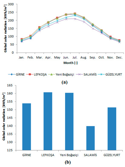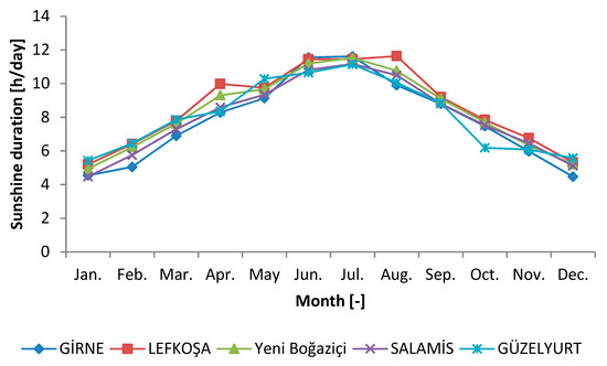 The mean monthly values of solar radiation for the selected regions are provided in Figure S7 in the Supplementary Material. The maximum global solar radiation of 248.9 kWh/m2 and 248.4 kWh/m2 were found in Salamis and Girne, respectively. These values were obtained in July 2009 for Salamis and June 2009 for Girne. In addition, the minimum global solar radiation was recorded in December 2009 with a value of 53.7 kWh/m2 at Salamis; this was followed by Girne, with a minimum value of 57.5 kWh/m2, which was recorded in December 2009. Moreover, the average monthly solar radiation during the investigation period is illustrated in Figure 6a. It was found that the maximum and minimum solar radiations were obtained in July and December, with values of 242.15 kWh/m2 at Lefkoşa and 65.75 kWh/m2 at Salamis, respectively. On the basis of the mean annual global solar radiation value (see Figure 6b), Lefkoşa had the highest global solar radiation with a value of 160.78 kWh/m2, followed by YeniBoğaziçi with a value of 160.33 kWh/m2. Moreover, the monthly mean sunshine duration hours for the five regions in Northern Cyprus are shown in Figure 7. It is observed that the minimum sunshine duration of 4.47h/day was recorded in December at Girne, while a maximum of 11.63 h/day was obtained in August at Lefkoşa. In addition, it is found that the average solar radiation was about 7.81h/day for Girne, 8.56h/day for Lefkoşa, 8.30h/day for YeniBoğaziçi, 7.99h/day for Salamis, and 8.07h/day for Güzelyurt.
