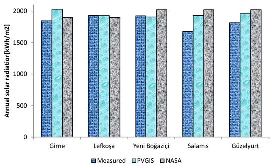 In reality, the accuracy of the satellite data is not enough to design a solar PV system [55,56,57]. Therefore, to ensure the accuracy of the performance of the PV solar system, the solar radiation values collected from satellite imagery based on the PVGIS and RETScreen databases are compared with the actual measurement data. Therefore, this section aims to investigate the global solar radiation using actual solar radiation and solar radiation estimates from satellite PVGIS_CMSAF (Photovoltaic Geographical Information System_Climate Monitoring Satellite Application Facility) and NASA databases. It is observed that the actual annual solar radiation was 1929 kWh/m2 for Lefkoşa and 1924 kWh/m2 for Yeni Boğaziçi, as shown in Figure 8. In addition, it is noticed that the actual value and estimated value of solar radiation are almost equal for the Lefkoşa region. Moreover, the mean monthly global solar radiation values for the five selected regions using the measured data and satellite imagery database are compared, as shown in Figure S8 in the Supplementary Material and listed in Table S1 in the Supplementary Material. It is noticed that there is a good correlation between the measured and estimated data for the global solar radiation. In addition, the accuracy of the estimated values obtained from PVGIS and NASA are examined by calculating the R2 and absolute error in percent, as shown in Table S1 in the Supplementary Material. It is found that the absolute error values were in the range 0.49%–26.9%. Additionally, the results showed that the two databases gave good estimations according to the value of R2, which is approximately 1.0. The difference between the measured and estimated values is mainly explained by the uncertainties and errors in the underlying data of radiation and temperature from the station.